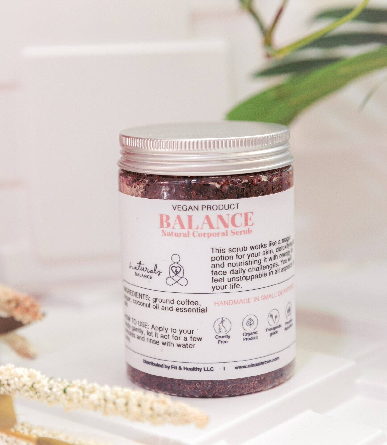 BALANCE scrub is a holistic blend designed to revitalize the skin and balance body energy. This formula combines natural ingredients that exfoliate, nourish, and promote a sense of harmony and energetic well-being. The synergy of coffee, sugar, coconut oil, and essential oils of laurel and orange works together to provide a complete personal care experience, uplifting both skin appearance and mood.